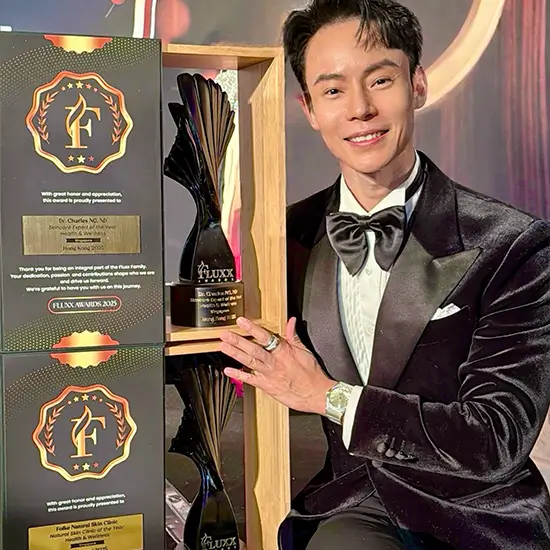 Charles Ng, ND, was honoured at the prestigious Fluxx Awards 2025, held at The Ritz-Carlton, Hong Kong, where he received the coveted Skincare Expert of the Year award. His clinic was also named Natural Skin Clinic of the Year in the Healthcare and Wellness category.