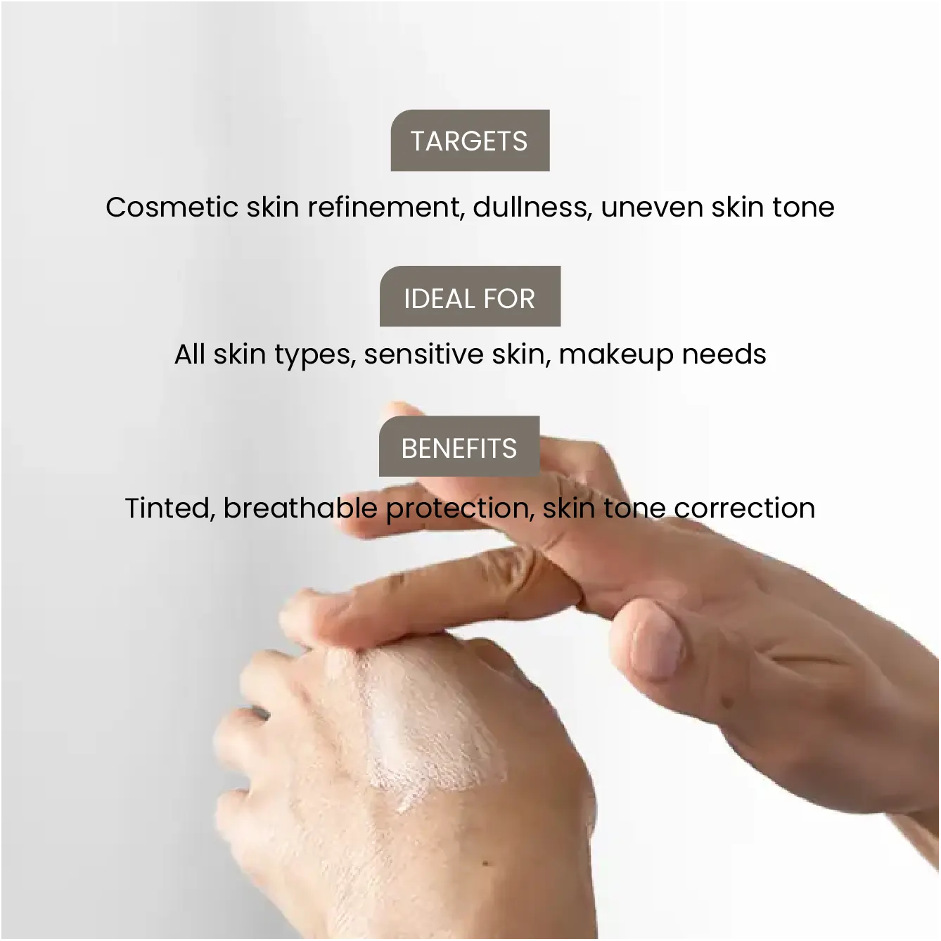 How to Use Apply or mix 1–2 micro pumps after or with sunscreen, before or in place of heavier makeup. For standalone use, dispense onto the back of the hand, spread a thin layer, and blend gently in circular motions across the face. Pat and layer to build coverage or highlight areas using your preferred contouring techniques.